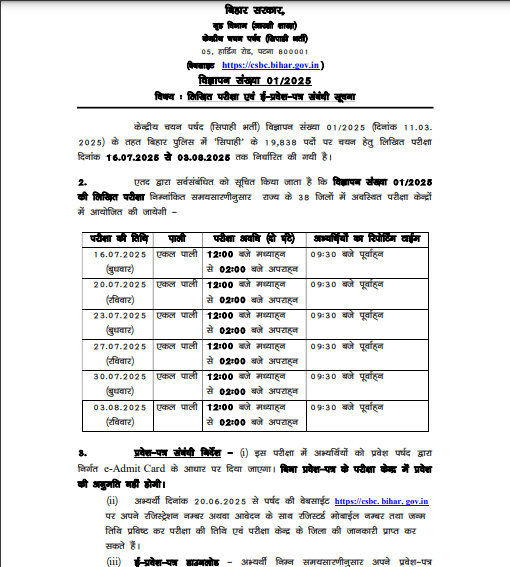 केंद्रीय चयन पर्षद (सिपाही भर्ती) के लिए CSBC के द्वारा बिहार पुलिस कांस्टेबल परीक्षा तिथि 2025 को घोषित कर दिया गया है, बिहार पुलिस कांस्टेबल लिखित परीक्षा का आयोजन बिहार राज्य के विभिन्न केदो पर 6 अलग-अलग तिथियां को करवाया जा रहा है। जिसके लिए एडमिट कार्ड भी जारी कर दिए गए हैं। सभी अभ्यर्थी आधिकारिक वेबसाइट से एडमिट कार्ड को डाउनलोड कर सकते हैं।